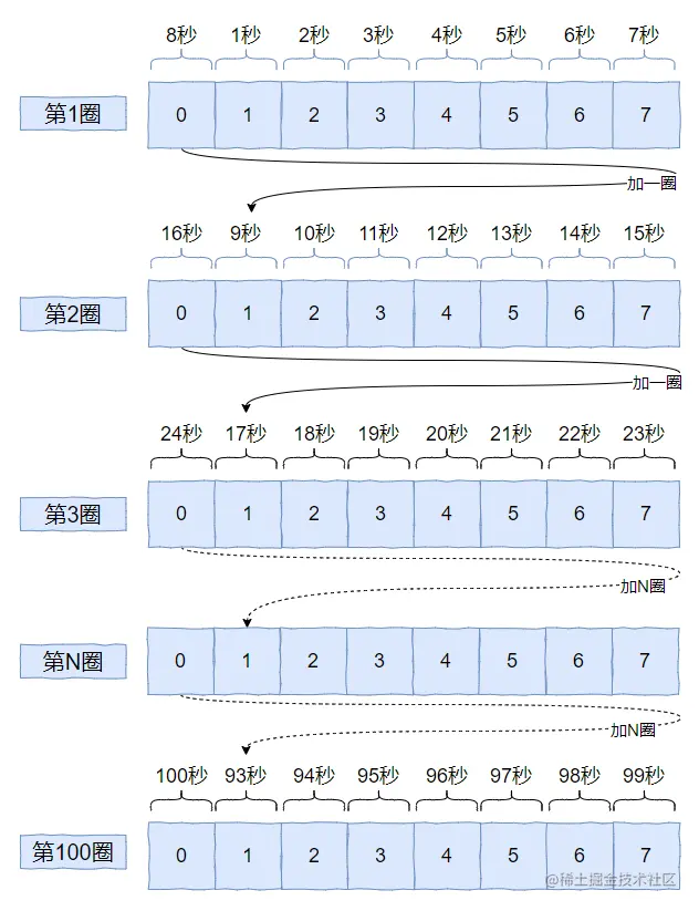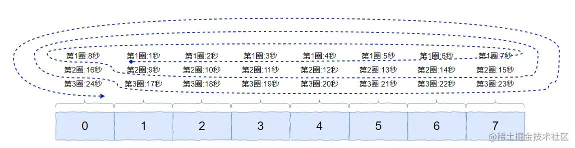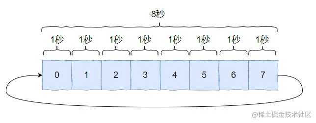 假如每个元素代表一秒钟,那么这个数组一圈能表达的时间就是 8 秒,就是这样的: