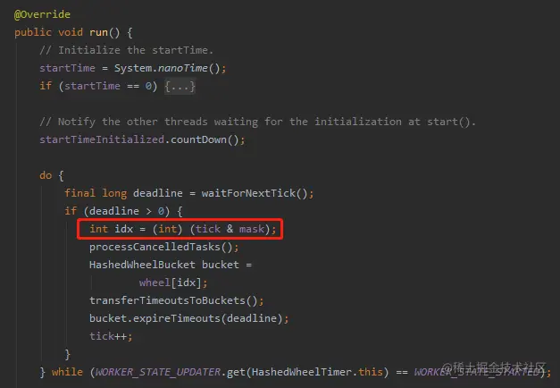 就来到了这一行代码 int idx = (int) (tick & mask)