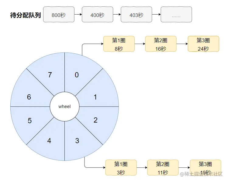 这里也就回答了我画图的时候留下的一个问题:什么时候把等待分配队列里面的任务挂到时间轮上去呢?