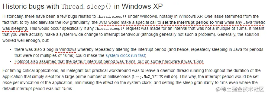 第一个划线的地方大概意思是说当线程调用 Thread.sleep 方法的时候,JVM 会进行一个特殊的调用,将中断周期设置为 1ms。