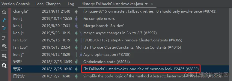 我都是有证据的,因为我是从 FailbackClusterInvoker 这个类的提交记录上看到了它的演进过程的,前面截图的代码也是优化之前版本的代码,并不是最新的代码:
