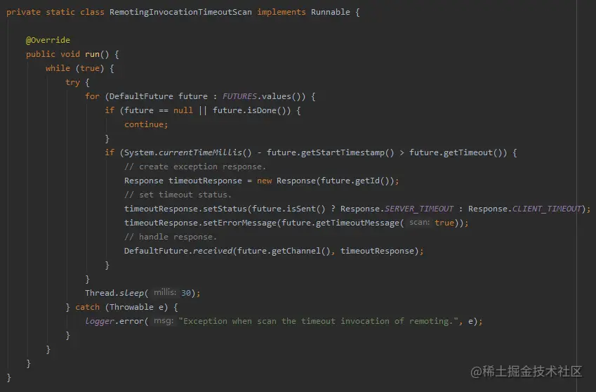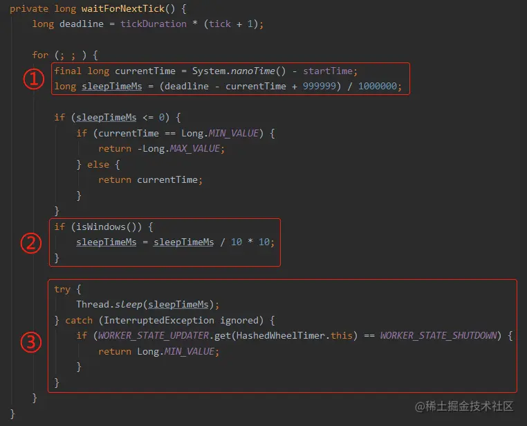 接着看 for 循环里面,前面部分都看的比较懵逼,只有标号为 ③ 的地方好理解的多,就是让当前线程睡眠指定时间。