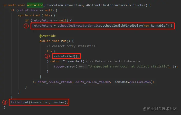另外,你可以在前面 addFailed 方法中看到标号为 ③ 的地方,是在往 failed 里面 put 东西。