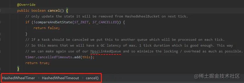 如果调用了 HashedWheelTimeout 的 cancel 方法,那么这个任务就算是被取消了。