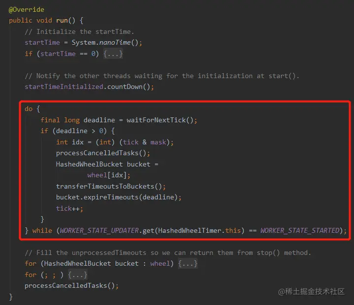 也就是说,只要时间轮没有被调用 stop 逻辑,这个线程会一直在运行。