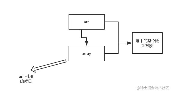 array 被初始化 arr 的拷贝也就是一个对象的引用,也就是说 array 和 arr 指向的时同一个数组对象。 因此,外部对引用对象的改变会反映到所对应的对象上。