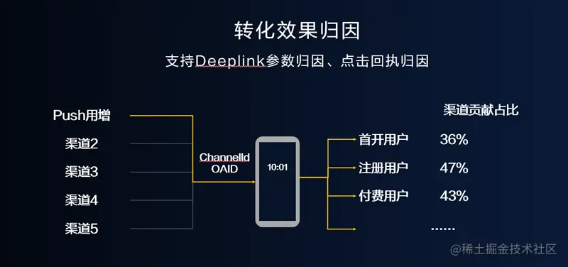 转化效果归因我们做了两个方案,一是提供Deeplink链接就可以做用户转化归因,二是通过服务器点击回执能力,以便观察到这个渠道投放后,对新用户的效果如何,付费用户是什么样的人群。各应用会经常做推广,比如推送和信息流,包括自然的流量,归因能力提供的参数,就可以很快算出,某渠道使用占比多少,达到的效果如何,更利于后期优化推送服务。