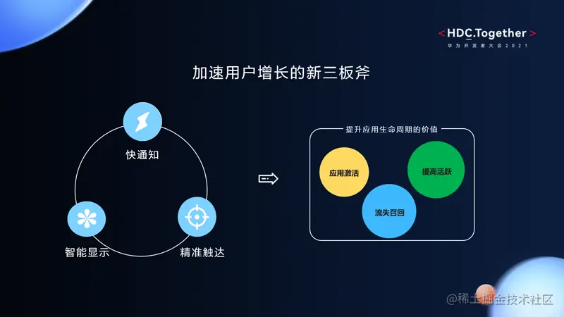 第三板斧:精准触达,是对于前面两项功能的重要补充。有的推送内容不合适会导致用户反感,我们就可以提供精准化的能力,将用户喜欢的消息推送给用户,在这方面去年我们还做了能力的提升——有预置用户标签,有RTA实时决策,还可以让开发者和华为对这个消费者共同作出判断,也就是转化效果归因,这样可以监控到推送效果如何,并及时调整策略。