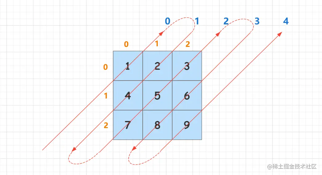 同一条对角线上的每个点(x, y)的横纵坐标之和 x + y相等,且都等于对角线的序号(仔细观察上图)。