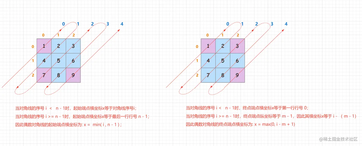 这样我们就确定了偶数对角线的起始和终点端点横坐标分别为x = min(i, n - 1)和x = max(0, i - m + 1),纵坐标为 i - x。(i是对角线序号)