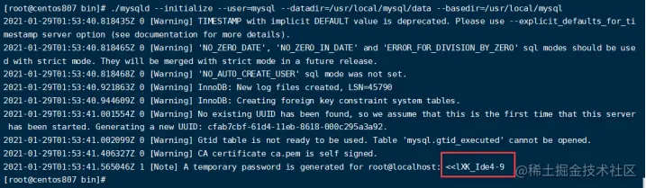 5、编译安装并初始化mysql,务必记住初始化输出日志末尾的密码(数据库管理员临时密码)