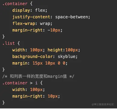 相关CSS如下,实现的关键就是占位的元素宽度和margin大小设置得和.list列表元素一样即可,其他样式都不需要写。