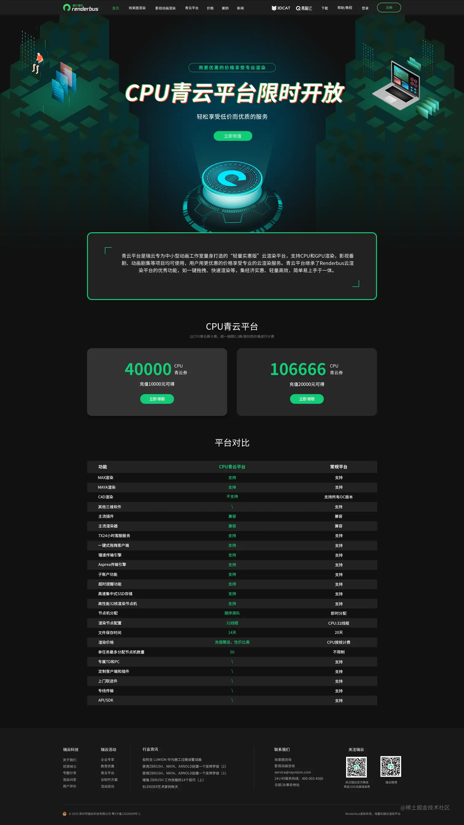 Renderbus瑞云渲染——青云平台超值渲染! 限时开放! Renderbus瑞云渲染农场 2021-11-16 145 阅读1分钟 Renderbus瑞云渲染——青云平台超值渲染! 限时开放! CPU渲染,低至0.0375元/核时!!! CPU渲染,低至0.0375元/核时!!! CPU渲染,低至0.0375元/核时!!! 充值10000元可得 ——40000CPU青云券 充值20000元可得 ——106666CPU青云券 活动时间:2021.11.15——11.30