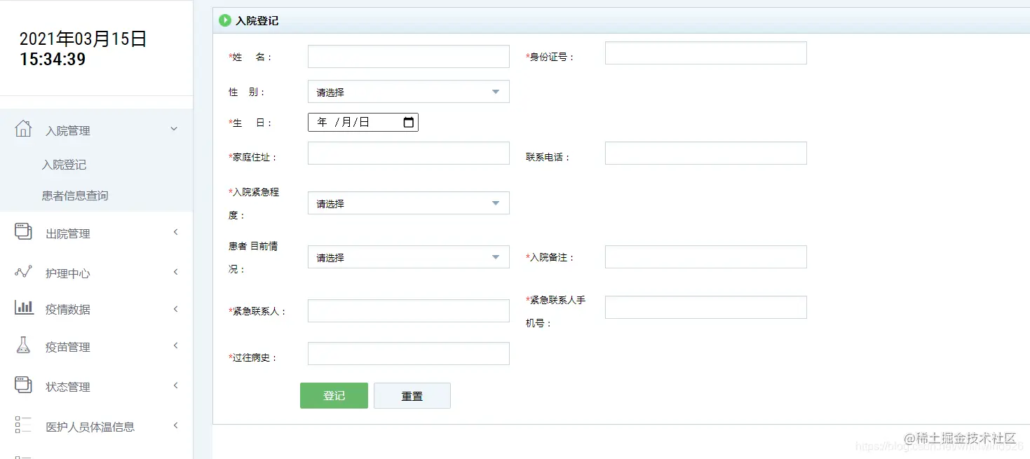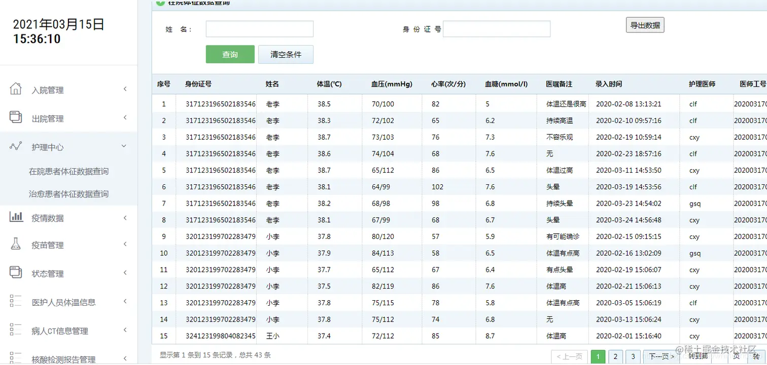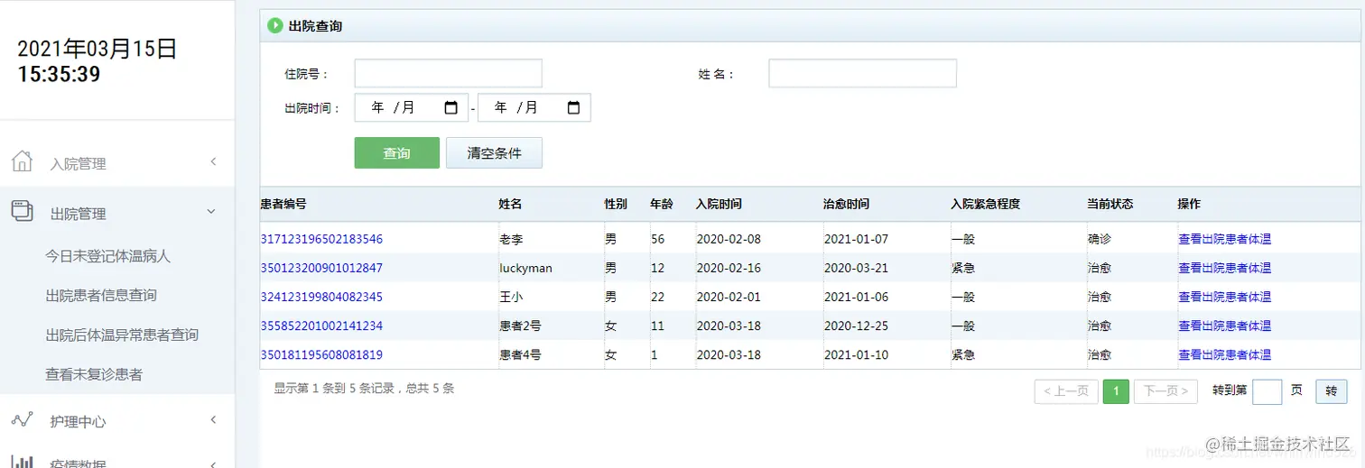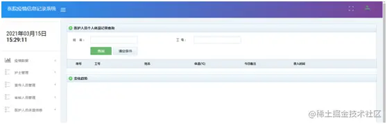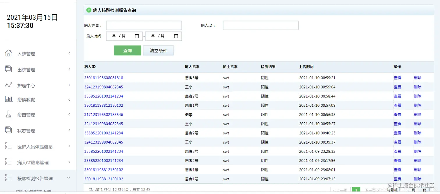 前台护士:主要完成入院管理,出院管理,护理中心,疫情数据查看,疫苗管理,状态管理,医护人员体温信息查看,病人CT 信息管理,核酸检测报告管理功能。