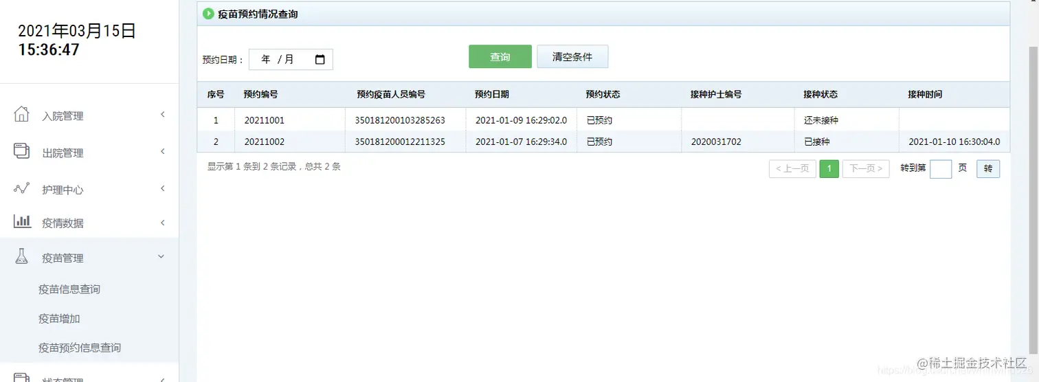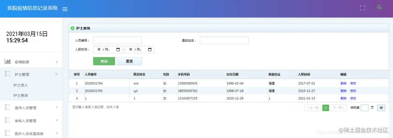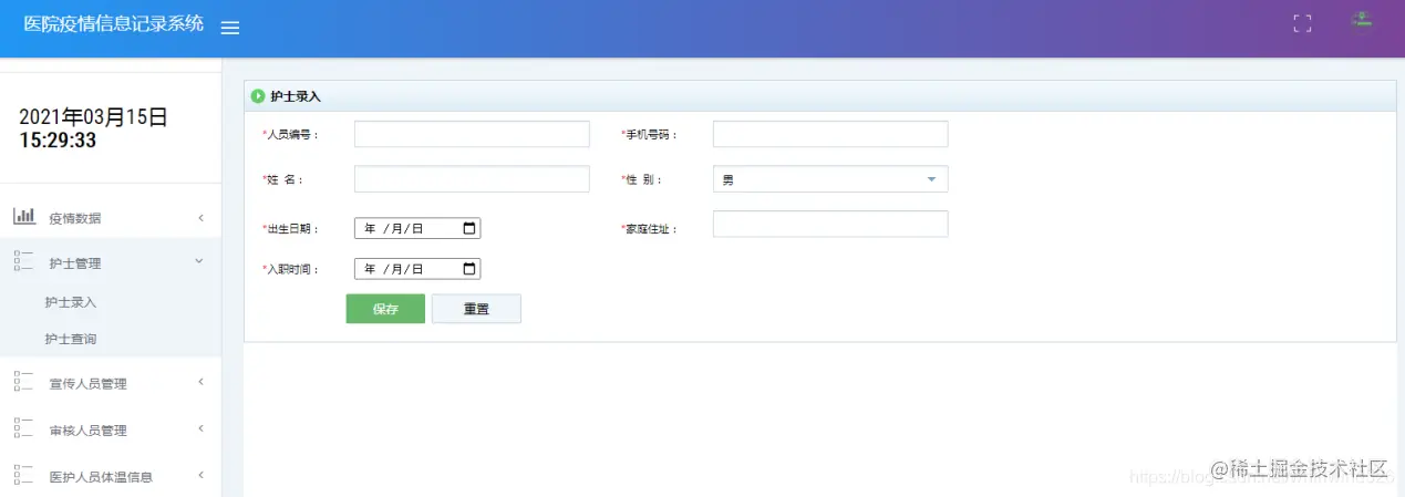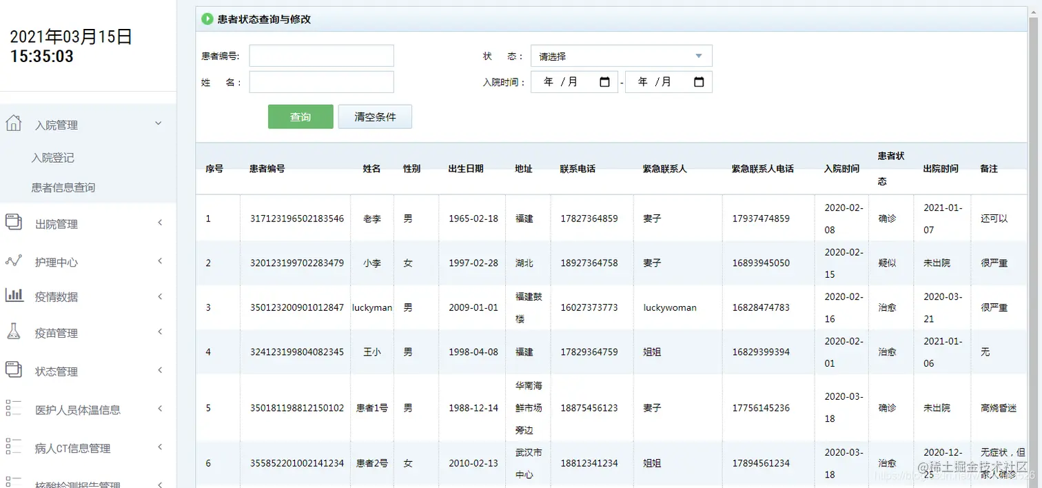 前台护士:主要完成入院管理,出院管理,护理中心,疫情数据查看,疫苗管理,状态管理,医护人员体温信息查看,病人CT 信息管理,核酸检测报告管理功能。