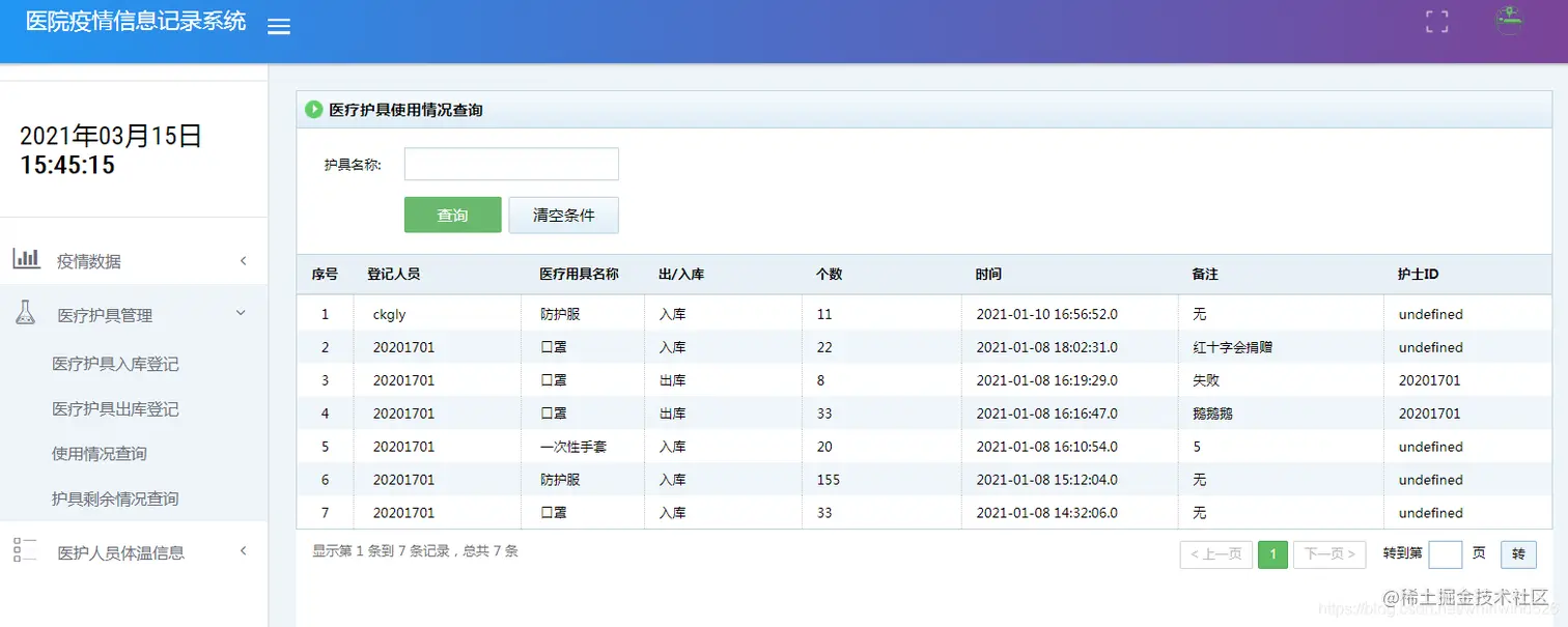 仓库管理人员:查看疫情数据,查看医护人员体温信息,医疗护具管理功能。