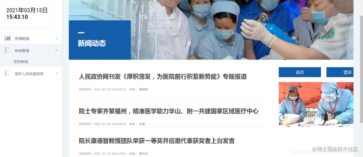 系统分为前台和后台,前台主要进行新闻的查看,疫情实时报告数据的查看,志愿者报名窗口,系统登陆窗口等。