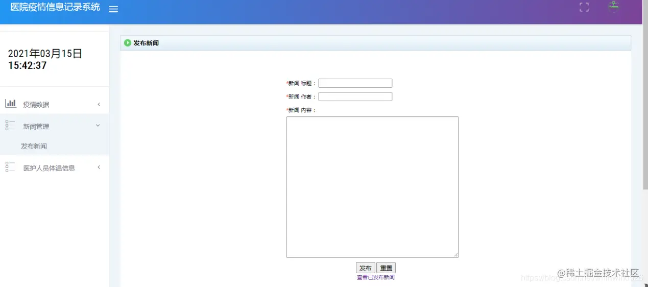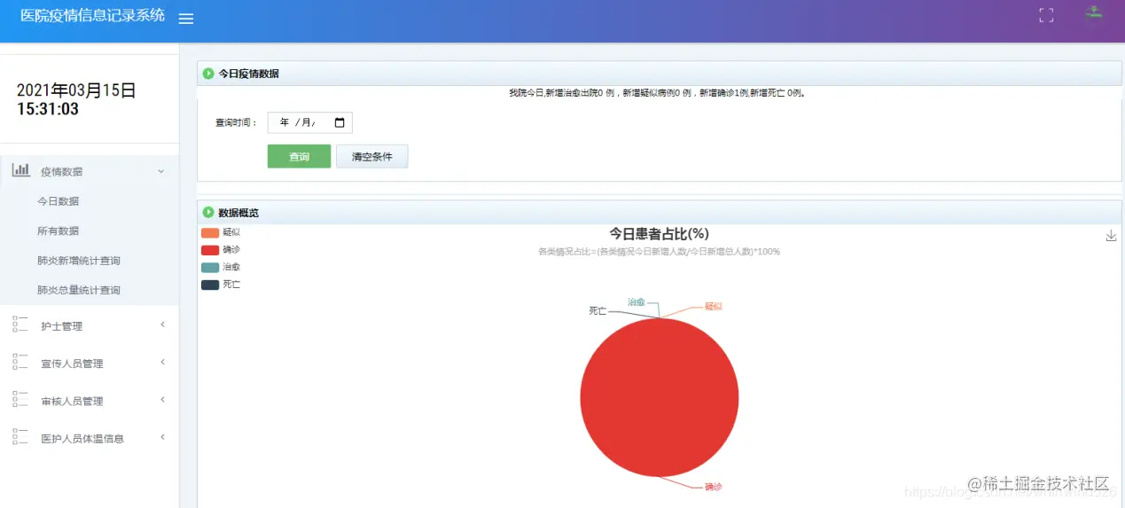 本系统主要实现医院疫情管理的相关功能,医院作为抗疫的第一线,对疫情的控制起着至关重要的作用!对于医院的疫情信息化上报及跟踪,就显的极为关键!
