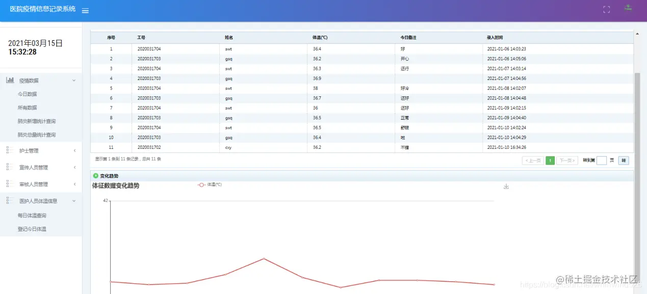 管理员: 管理护士,管理管理传人员,管理审核人员,查看疫情数据,查看每日护士测量体温数据。