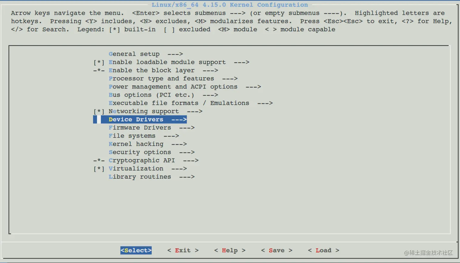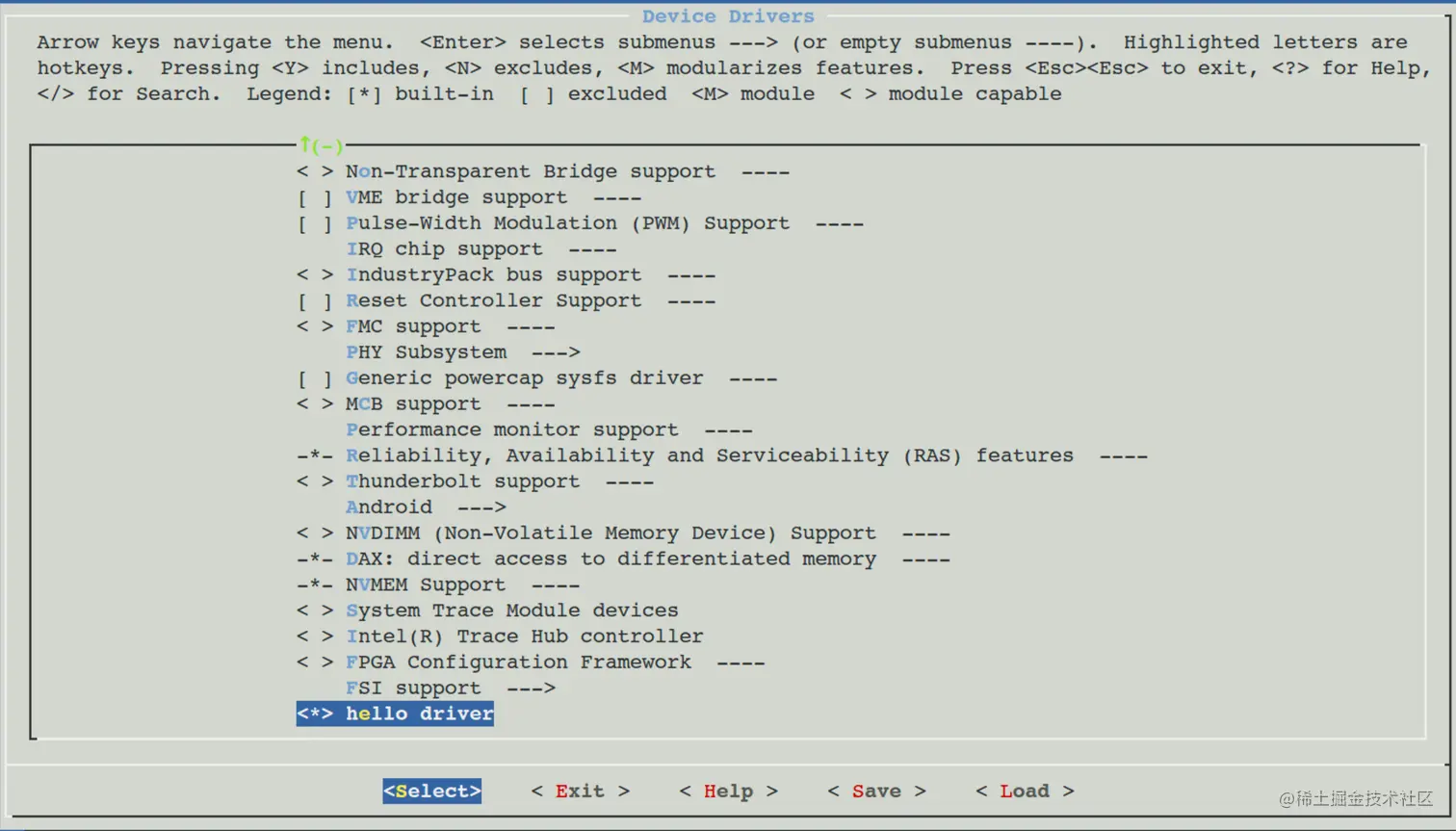 第3条指令,是用来配置内核的,可以进入 Device Drivers 菜单,然后在最底层看到我们的 hello driver 被标记成星号,
