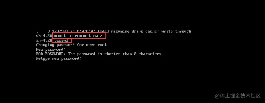 接着输入完成后,ctrl+x 进入单用户模式,再输入 mount -o remount,rw / & passwd 即可更改密码!
