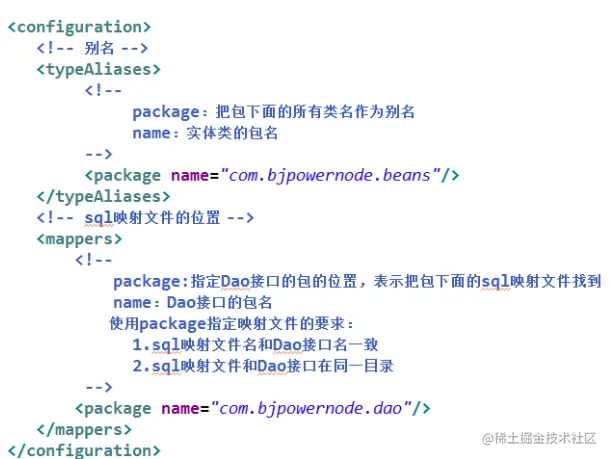 (2)这里对 mapper 映射文件的注册,使用标签,即只需给出 mapper 映射文件 所在的包即可。因为 mapper 的名称与 Dao 接口名相同,可以使用这种简单注册方式。这种 方式的好处是,若有多个映射文件,这里的配置也是不用改变的。当然,也可使用原来的标签方式。