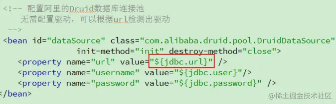 - Spring 配置文件从属性文件中读取数据时,需要在的 value 属性中使用${ }, 将在属性文件中定义的 key 括起来,以引用指定属性的值。
