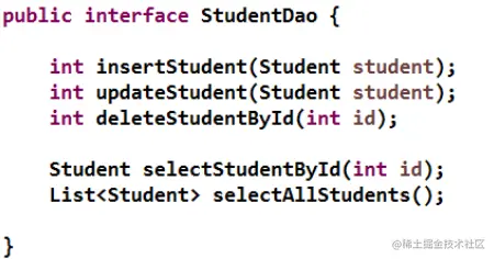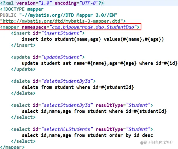 - 在 Dao 接口的包中创建 MyBatis 的映射文件 mapper,命名与接口名相同,本例为StudentDao.xml。mapper 中的 namespace 取值也为 Dao 接口的全限定性名。