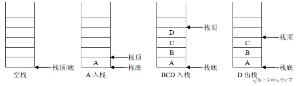 栈空间是累加型结构: 如果想要复写第一个放入的数据,必须先将后面存放的数据丢弃, 类似于递归, 适合嵌套数据,这也是为什么函数和函数中的局部变量都存放在栈中的原因