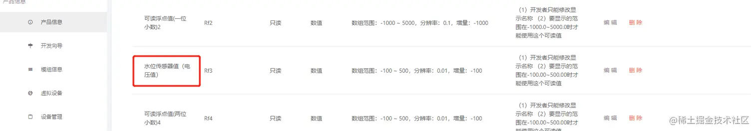本例中我们使用了"Rf3"这个两位小数浮点型数据点作为水位传感器电压值的上传数据通道,记得在机智云平台修改相应的数据点的名称。