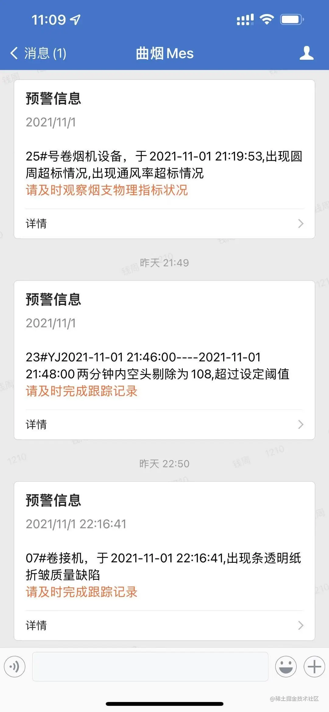 2、质量风险预警系统: 曲烟将沉淀的大量工业数据进行数学建模,构建起质量风险预警模型,对设备剔除、停机、消耗甚至外挂设备状态等关键数据进行实时监控,若出现异常将以短信、微信、大屏推送的方式将信息传送到相关职能人员手中,形成 PDCA 的管理闭环,将传统人找事转变为事找人的工作模式。