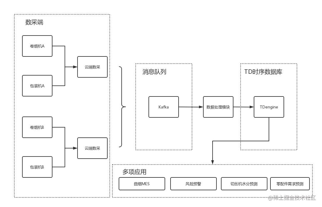 基于曲烟已搭建的私有云平台,我们将 TDengine 部署到云端,中间借助 Kafka 作为消息中间件作为系统消息总线,将数采软件采集到的卷烟机、包装机等实时工作状态数据推送到其中,之后通过多个消费者消费入库 TDengine,进而支撑上层的 MES、风险预警、切丝机水分预测、零配件需求预测等业务应用服务。具体架构如下: