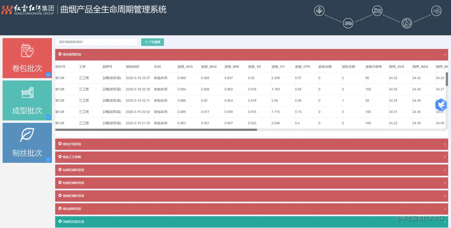 1、基于二维码的产品全生命周期系统: 将一包烟从制丝、卷包、成型生产环节的工艺信息、质检信息、原料信息、辅料信息、设备信息等多方数据进行平台汇聚,通过烟包唯一二维码进行关联,实现了产品的数字化,为协同提升产品内在品质形成数据支撑。