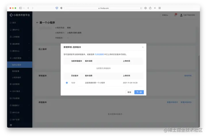 在审核通过后,点击「审核版本」卡片右侧的「版本上架」,就可以将小程序上架在 FinClip.com 中了。