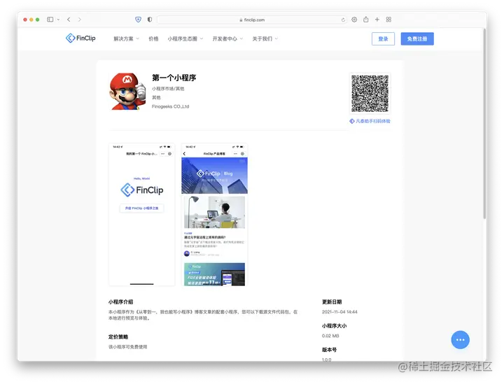 为了帮助你更好的体验,了解小程序的使用模式,我已经将这个小程序上架到了 FinClip 的小程序应用市场中,你可以下载小程序的代码包进行修改,看看会有什么新的变化。