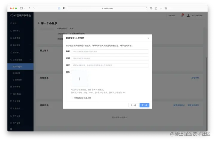 然后,我们需要登录 FinClip ,点击首页或左侧的「小程序管理」,进入到已经新建好的小程序详情中,进行小程序的提审与上架操作。