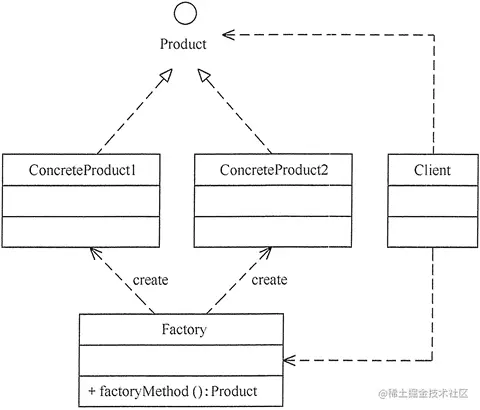 我们把被创建的对象称为“产品”,把创建产品的对象称为“工厂”。如果要创建的产品不多,只要一个工厂类就可以完成,这种模式叫“简单工厂模式”,它不属于 GoF 的 23 种经典设计模式,它的缺点是增加新产品时会违背“开闭原则”。