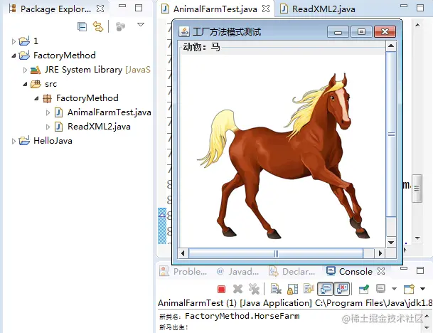 对养马场和养牛场等具体工厂类,只要定义一个生成动物的方法 newAnimal() 即可。由于要显示马类和牛类等具体产品类的图像,所以它们的构造函数中用到了 JPanel、JLabd 和 ImageIcon 等组件,并定义一个 show() 方法来显示它们。