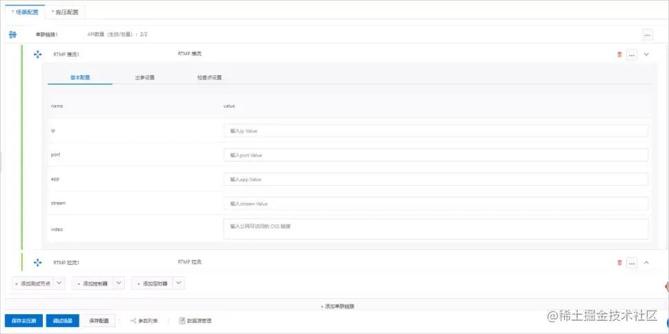 针对以上问题,PTS 加入了 RTMP/HLS 协议,并且结合压测场景做了抽象,让用户可以界面化的使用不同协议的压测。