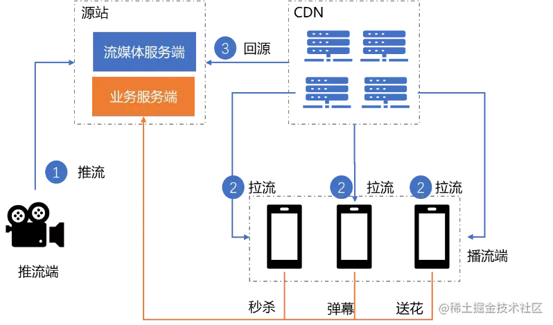 在这个推拉的逻辑中,由于涉及视频的流量较大,经过的路线较长,对流媒体服务器都会造成冲击;通场的做法是引入 CDN,当用户开始收看视频的时候,会先就近去 CDN 拉取流,如果这个时候视频内容还没有缓存在 CDN 的时候,CDN 就回源到流媒体服务端。
