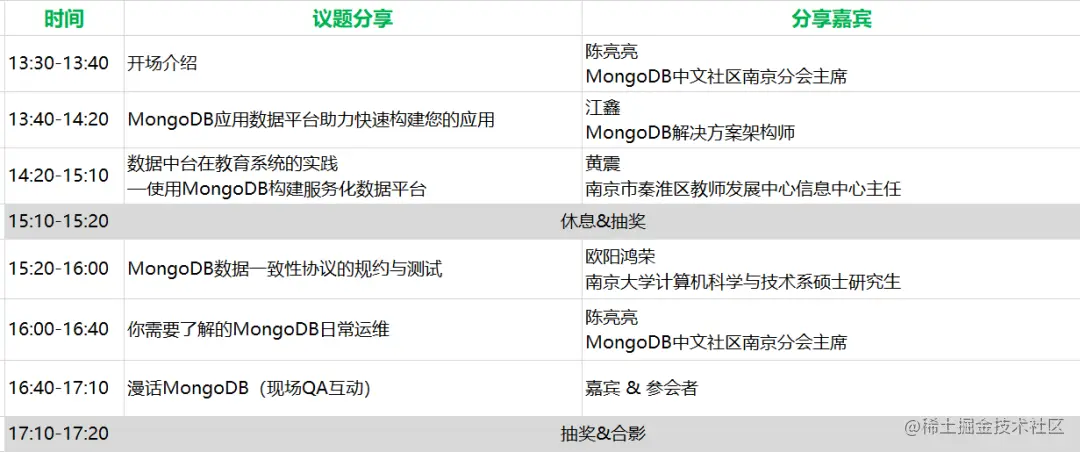 详细议题及嘉宾介绍请点击此处进行阅读:【议程公布】2021年MongoDB中文社区南京技术沙龙