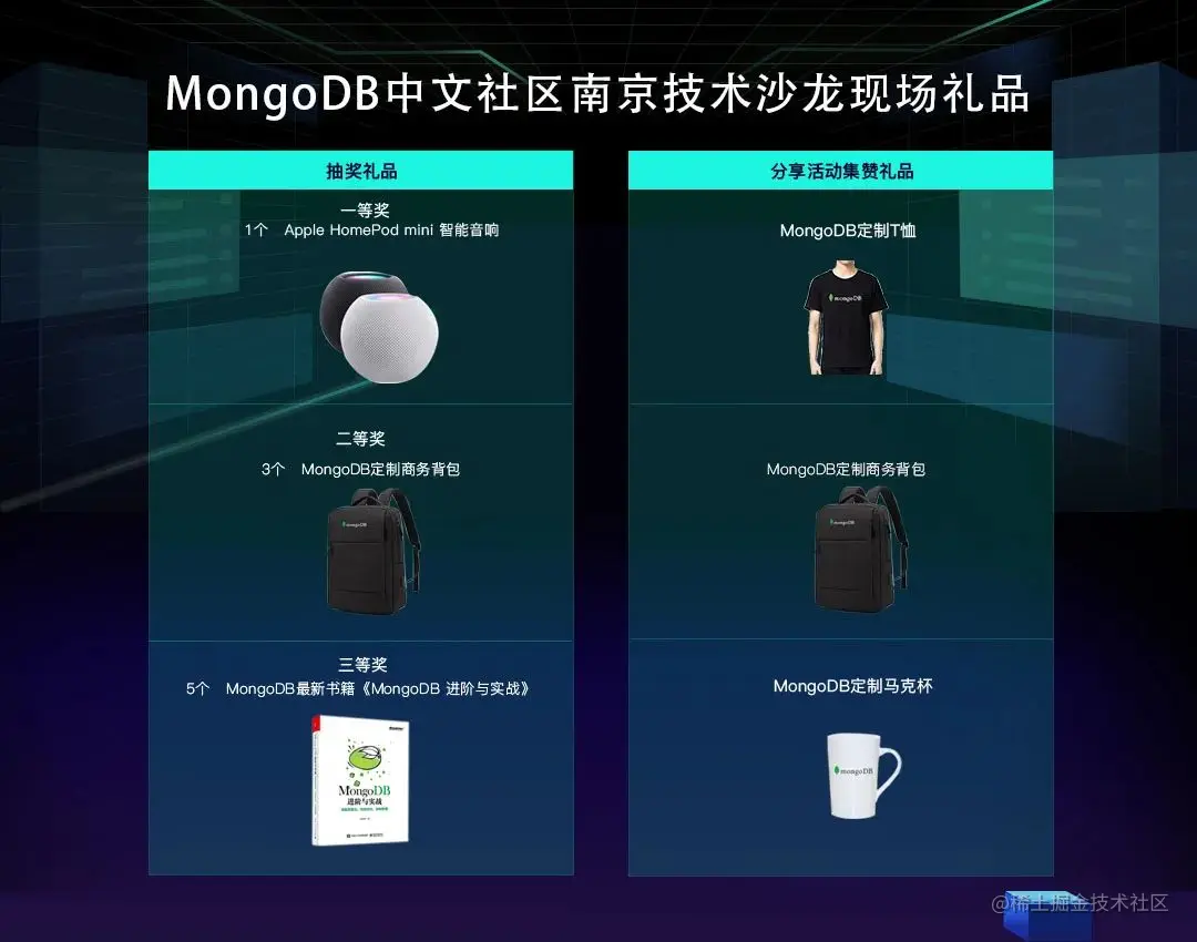 Apple HomePod mini智能音箱,MongoDB定制商务背包,MongoDB最新书籍《MongoDB 进阶与实战》,抽奖大礼尽在MongoDB中文社区南京活动现场等你拿!