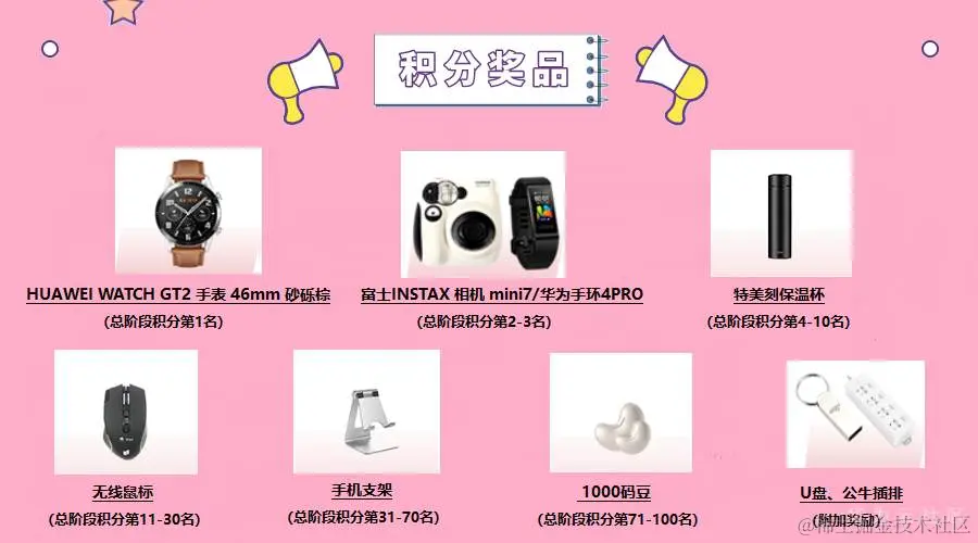 做任务,换积分,兑奖品。优秀学员可兑换HUAWEI GT智能手表、富士INSTAX 一次成像相机 mini7、4Pro智能手环等数10种奖品等你来拿。