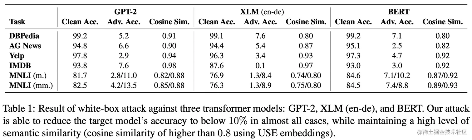 实验结果表明,作者的攻击能够在几乎所有情况下将模型的准确率降低到10%以下,同时保持高水平的语义相似性(余弦相似度高于0.8)