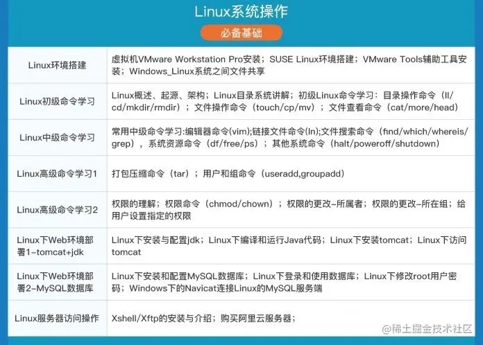 Linux环境搭建,Linux初级命令学习,Linux中级命令学习,Linux高级命令学习,Linux下Web环境部署1-tomcat+jdk,Linux下Web环境部署2-MySQL数据库,Linux服务器访问操作。
