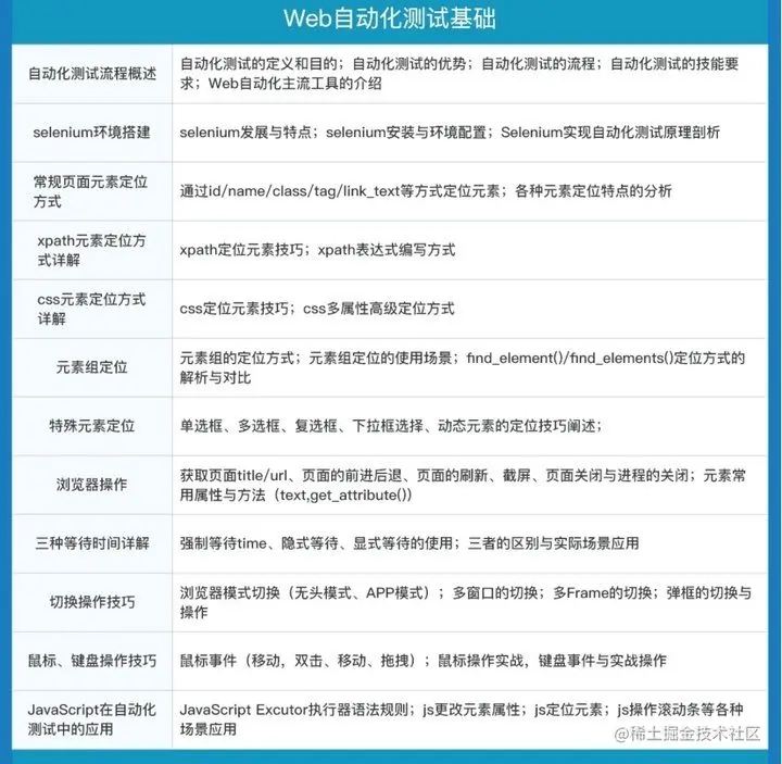 自动化测试流程概述,selenium环境搭建,常规页面元素定位方式,xpath元素定位方式详解,css元素定位方式详解,元素组定位,特殊元素定位,浏览器操作。三种等待时问详解,切換操作技巧,鼠标、键盘操作技巧,JavaScript在自动化测试中的应用