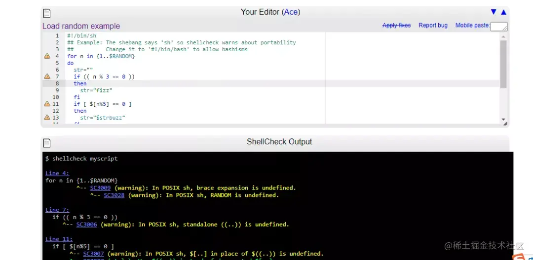 可以将 shell 脚本代码黏贴到官网检测页面上,可以即时获得反馈: