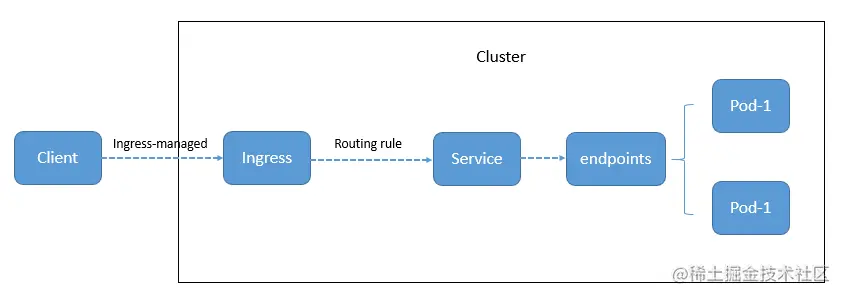 Ingress 可以更简单的理解为是暴露 HTTP 和 HTTPS 路由到外部集群,提供外部访问,非常类似 Nginx。访问流量的路由信息,通过 Ingress 资源定义的规则来控制,如下图中,外部客户端访问资源,先通过 Ingress-managed 访问到集群内的 Ingress,通过路由规则对应到了相应的 service,再基于 kube-proxy 将 Pod 的IP 和端口,以 endpoints 的方式暴露出来。所以如果在业务访问中发现没有 endpoints,那实际业务访问肯定也会出现问题。接下来我们看看具体的流程是如何一步一步关联起来的。