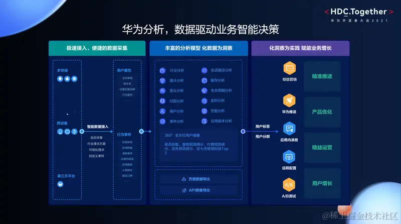 先从整体上讲一下“华为分析服务”这个产品,华为分析是一个多平台、跨设备的智能数据分析平台,从端侧看华为分析不仅仅是局限于华为手机上App的分析能力,我们还支持iOS、WEB、快应用、HarmonyOS等平台,同时也是支持多重设备,包括平板、大屏等。