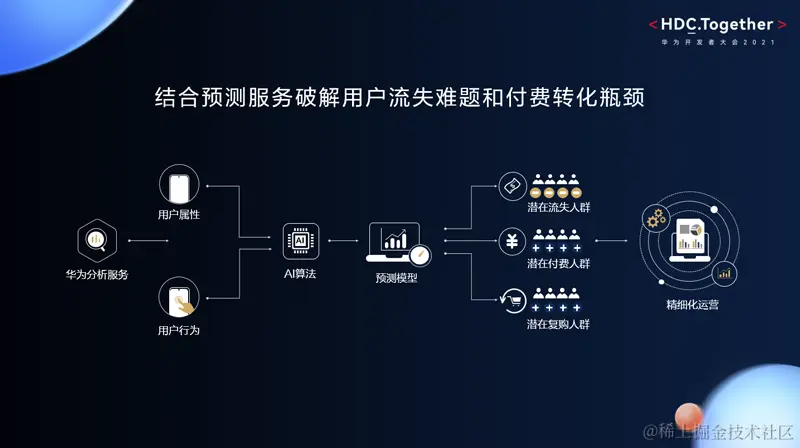 其实对于很多中小型App来说,要从0-1去构建自身的AI能力和产品还是比较困难的。而我们预测是基于应用内的行为特性、不同的算法等构建的预测模型,来帮助开发者预测出应用内即将流失的用户和待付费的用户。运营人员可以针对这部分用户去做精准营销,包括流失召回、付费促销等等。